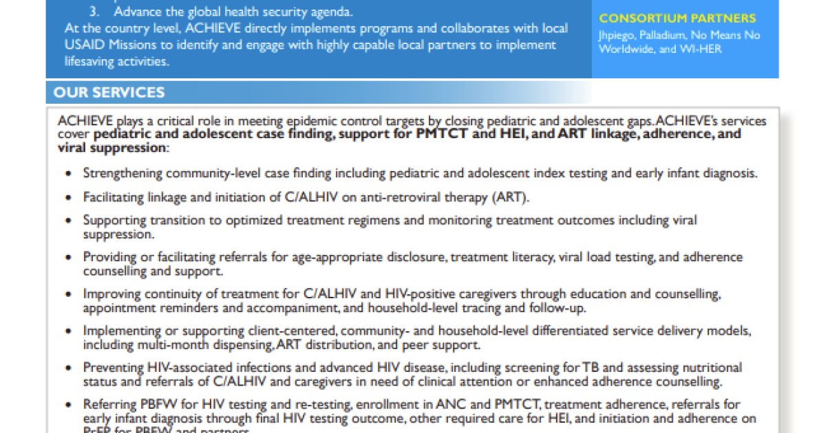 The Adolescents and Children HIV Incidence Reduction, Empowerment, and Virus Elimination project, or ACHIEVE, is a five-year global effort to reach and sustain HIV epidemic control among pregnant and breastfeeding women, adolescents, infants, and children. This fact sheet provides an overview of the project and its menu of services.