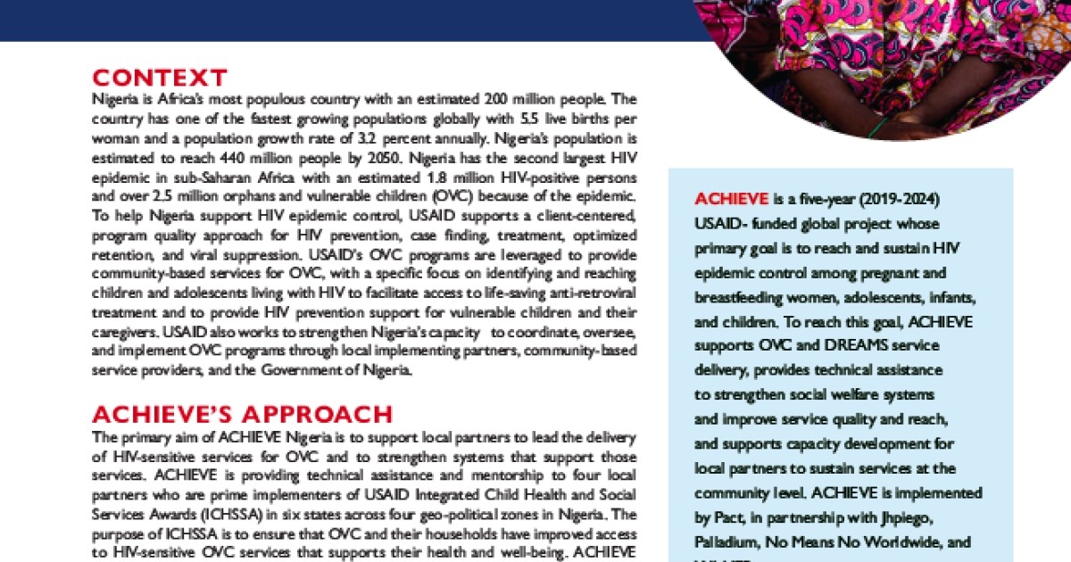 The primary aim of ACHIEVE Nigeria is to support local partners to lead the delivery of HIV-sensitive services for OVC and to strengthen systems that support those services. ACHIEVE provides technical assistance to the USAID Integrated Child Health and Social Services Award’s (ICHSSA) partners in the areas of OVC program implementation, social welfare systems strengthening, and OVC information systems improvements to manage and use program data. This fact sheet provides an overview of the ACHIEVE project in Nigeria, its services, and notable achievements.