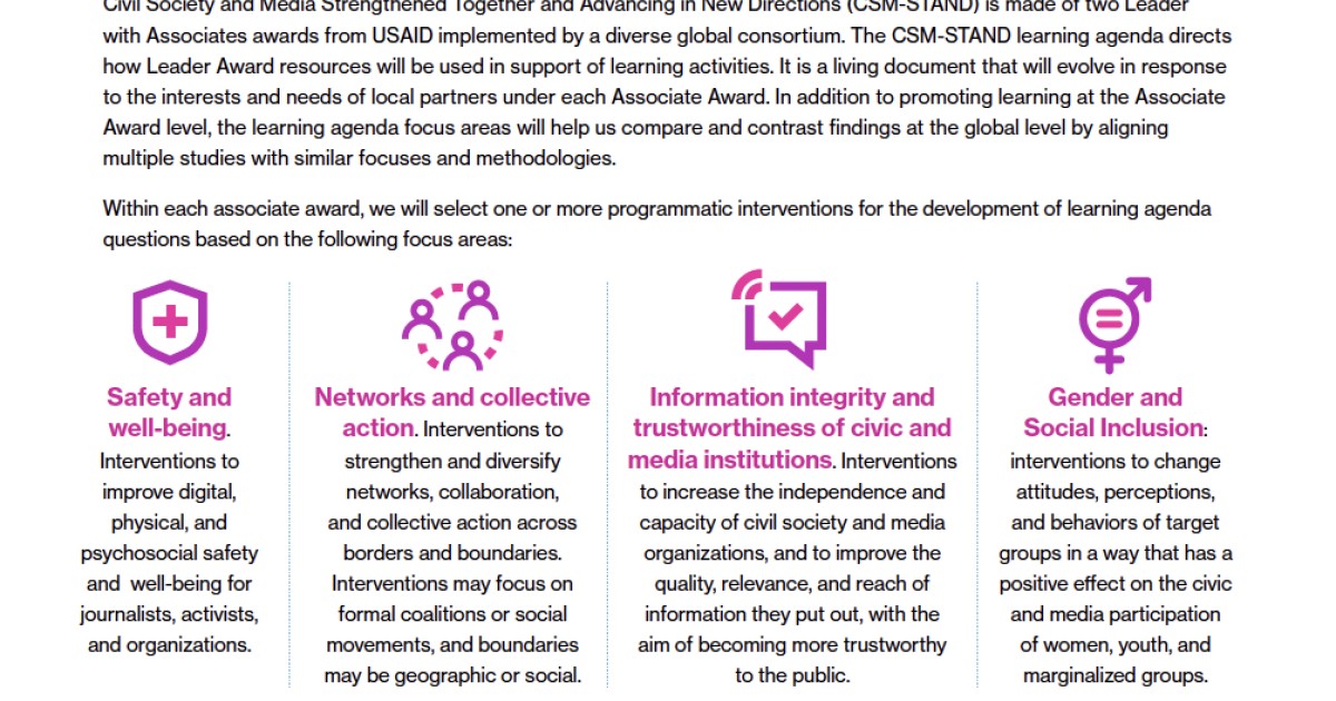 The CSM-STAND learning agenda directs how the Leader Award resources will be used in support of learning activities. It is a living document that will evolve in response to the interests and needs of local partners under each Associate Award. In addition to promoting learning at the Associate Award level, the learning agenda focus areas will help us compare and contrast findings at the global level by aligning multiple studies with similar focuses and methodologies.