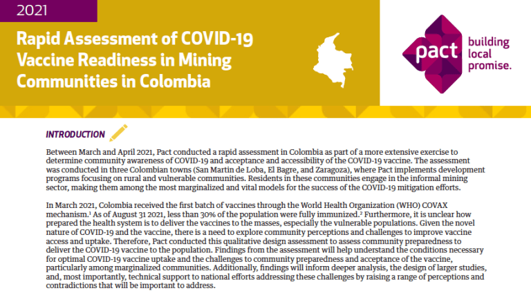 Early this year, Pact joined efforts to collect and contribute insights into community readiness and preparedness for the Covid-19 vaccine. Our goal was to complement other population-based surveys on intention to receive the vaccine and highlight the views of communities that Pact serves through existing programs as well as opportunities to ready them for the arrival of the vaccine. We recently completed a rapid assessment in Colombia where Pact engages with artisanal and small-scale gold miners (ASM) to improve their working conditions.
