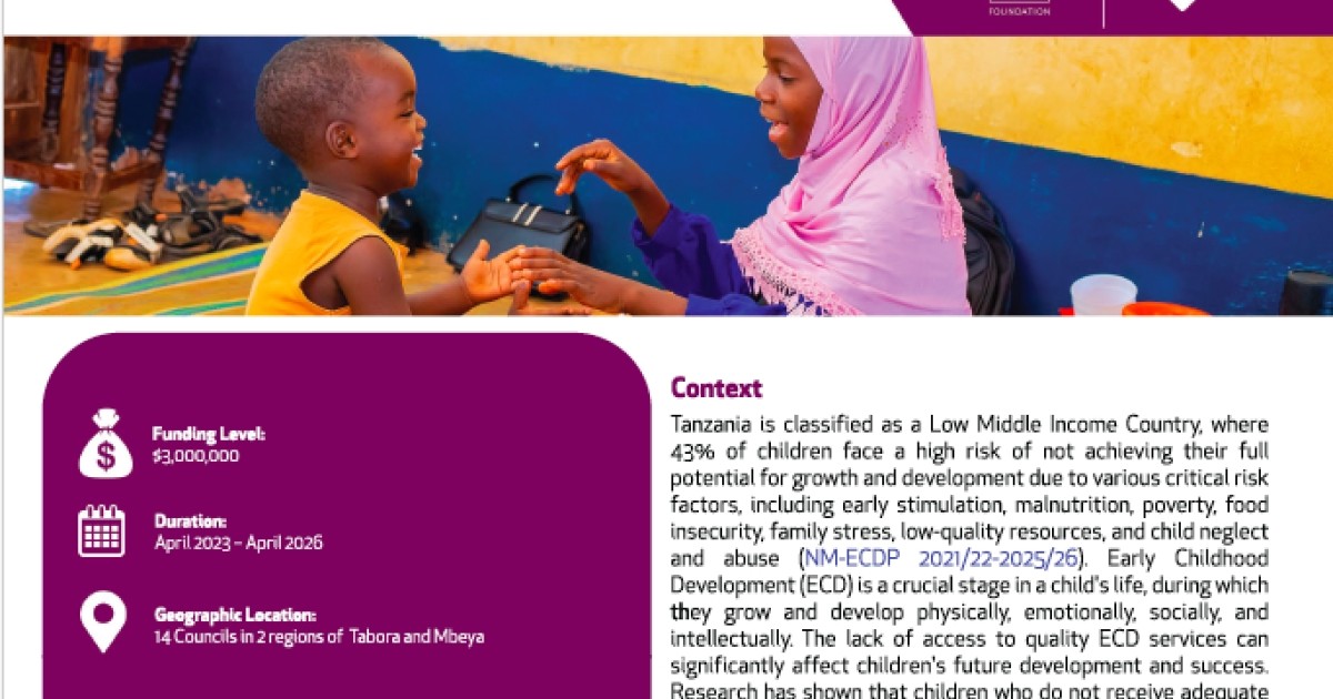 This fact sheet provides an overview of the Early Childhood Development project. The project's primary objective is to provide complementary integrated ECD services to vulnerable households in Tanzania. The project is integrated with the Pact-led ACHIEVE project, which focuses on improving the health and well-being of orphans and vulnerable children, particularly those living with HIV/AIDS or at high risk of contracting HIV.