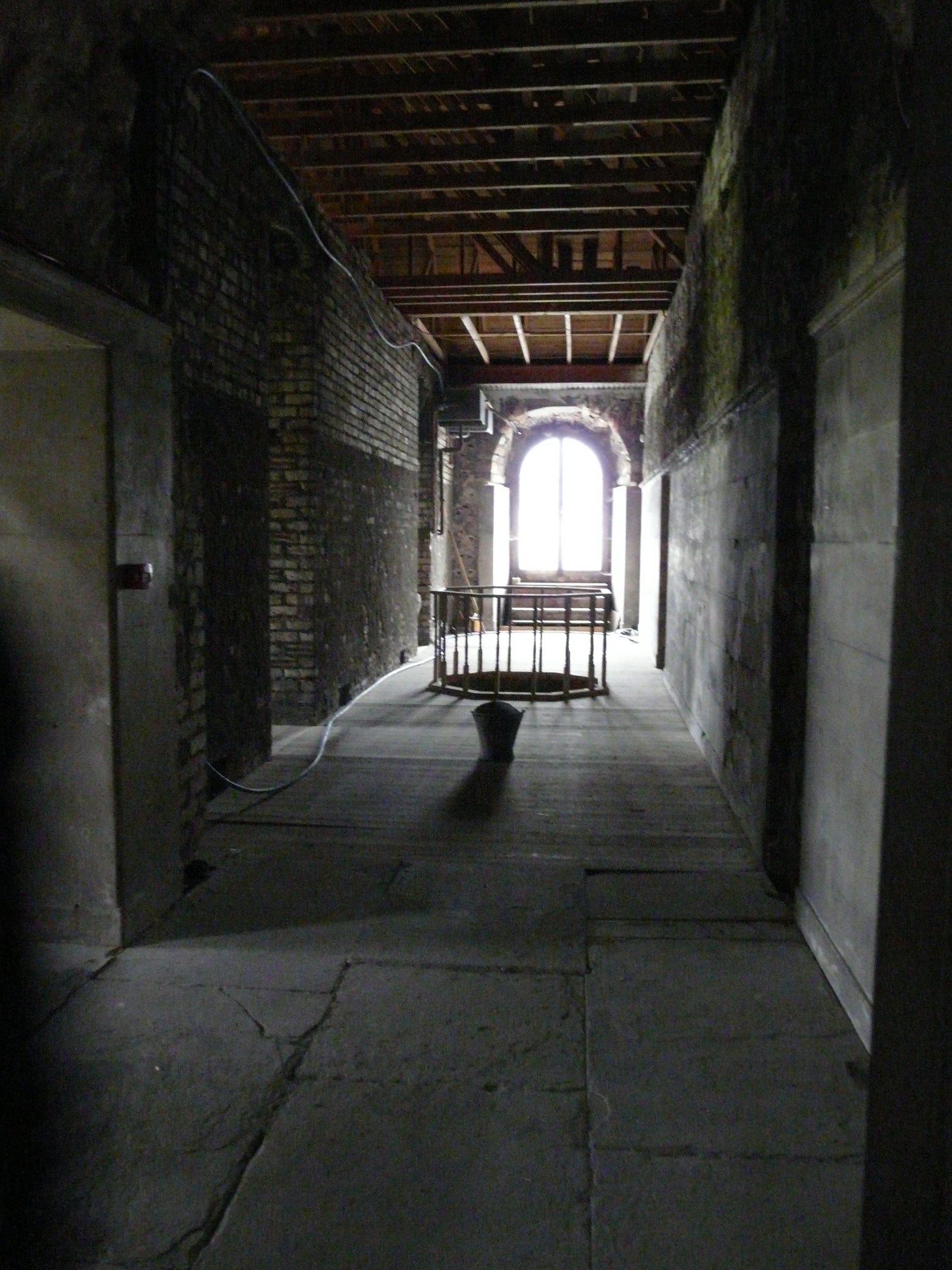 Stone floor and wall corridor in attic area. Exposed beams in ceiling. Large arched window
