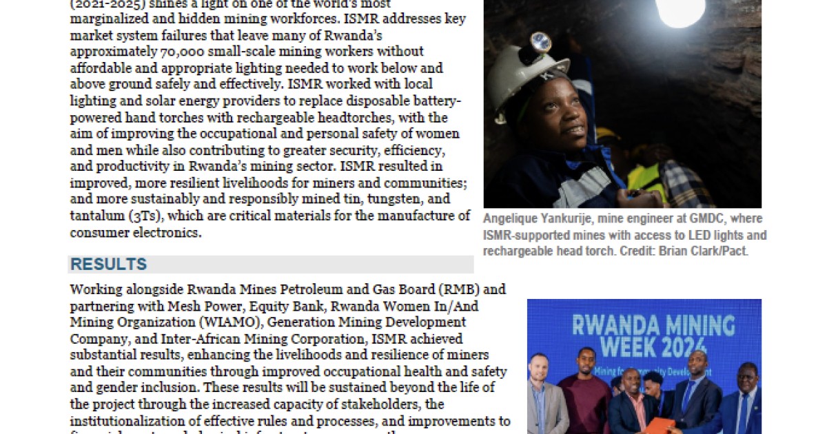 This technical brief details the results of the Illuminating Small-Scale Mining in Rwanda project, which aimed to address key market system failures that leave many of Rwanda’s approximately 70,000 small-scale mining workers without affordable and appropriate lighting needed to work below and above ground safely and effectively. ISMR resulted in improved, more resilient livelihoods for miners and communities; and more sustainably and responsibly mined tin, tungsten, and tantalum, which are critical materials for the manufacture of consumer electronics.