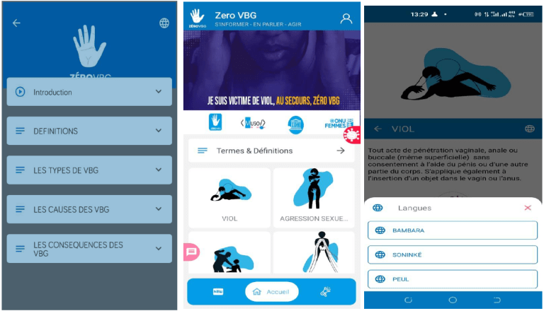 Zero GBV had created low-cost prototypes before investing in a full application, which allowed the organization to determine the best user experience and remove bugs before investing in further development. Testing of the application saved them time and money and resulted in a more impactful resource for women and girls. The team also ensured the application had voice memo functionality—critical to users with low or no literacy—and used the local languages of Bamara, Soninké and Peul.