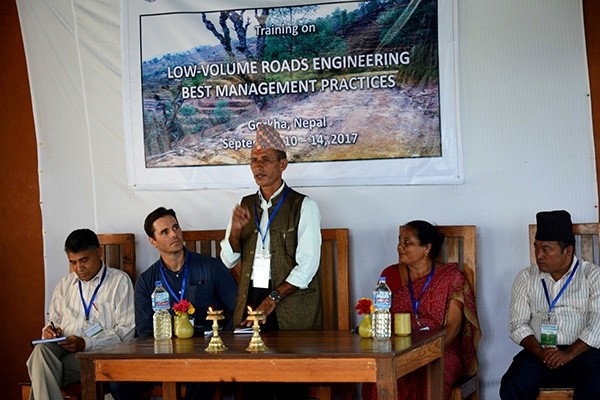 In September, the Forest Service and Sajhedari Bikaas partnered to deliver a five-day training on low-volume roads engineering best practices. It was held in Gorkha, where most of Sajhedari Bikaas’s road repair work took place. Twenty-one local engineers attended, including seven women and a government engineer, and the event was officially opened by the local mayor and deputy mayor. The training cadre consisted of Erica Borum and Mark Weinhold, both water resource engineers with the Forest Service, and Dr. Tara Nidhi Bhattarai, a professor of geology at Tribhuvan University in Kathmandu.