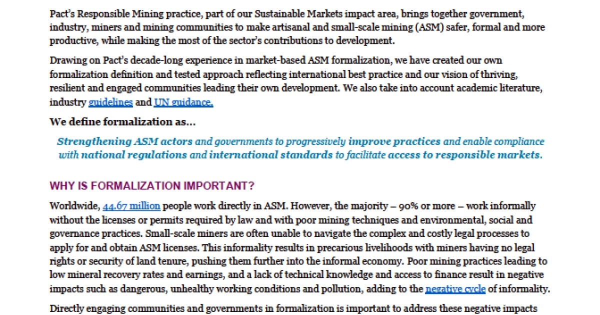 Drawing on our decade-long experience in market-based artisanal and small-scale mining formalization, Pact has created our own formalization definition and tested approach reflecting international best practice and our vision of thriving, resilient and engaged communities leading their own development. This fact sheet provides an overview of that approach.