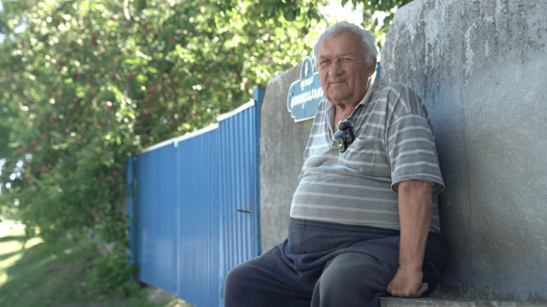 Anatoliy Nahornyi sits on a bench by his house. He has trouble walking long distances. For people like him, this means travelling more than 50 kilometres (31 miles) to see a doctor and undergo necessary tests, often relying on several bus connections, so the transportation services provided by the medical teams have been a blessing.