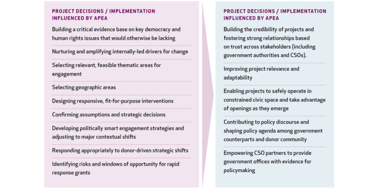 Each project was designed to undertake PEAs systematically (at a minimum during the inception phase and then annually). The learning review traced how the projects have used PEA insights in their decision-making, and whether and how these decisions have contributed to project implementation and achievements.