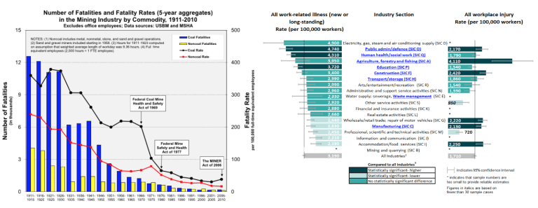 - Health impacts of exposure to dust, noise, underground work and heavy, repetitive, physical labor